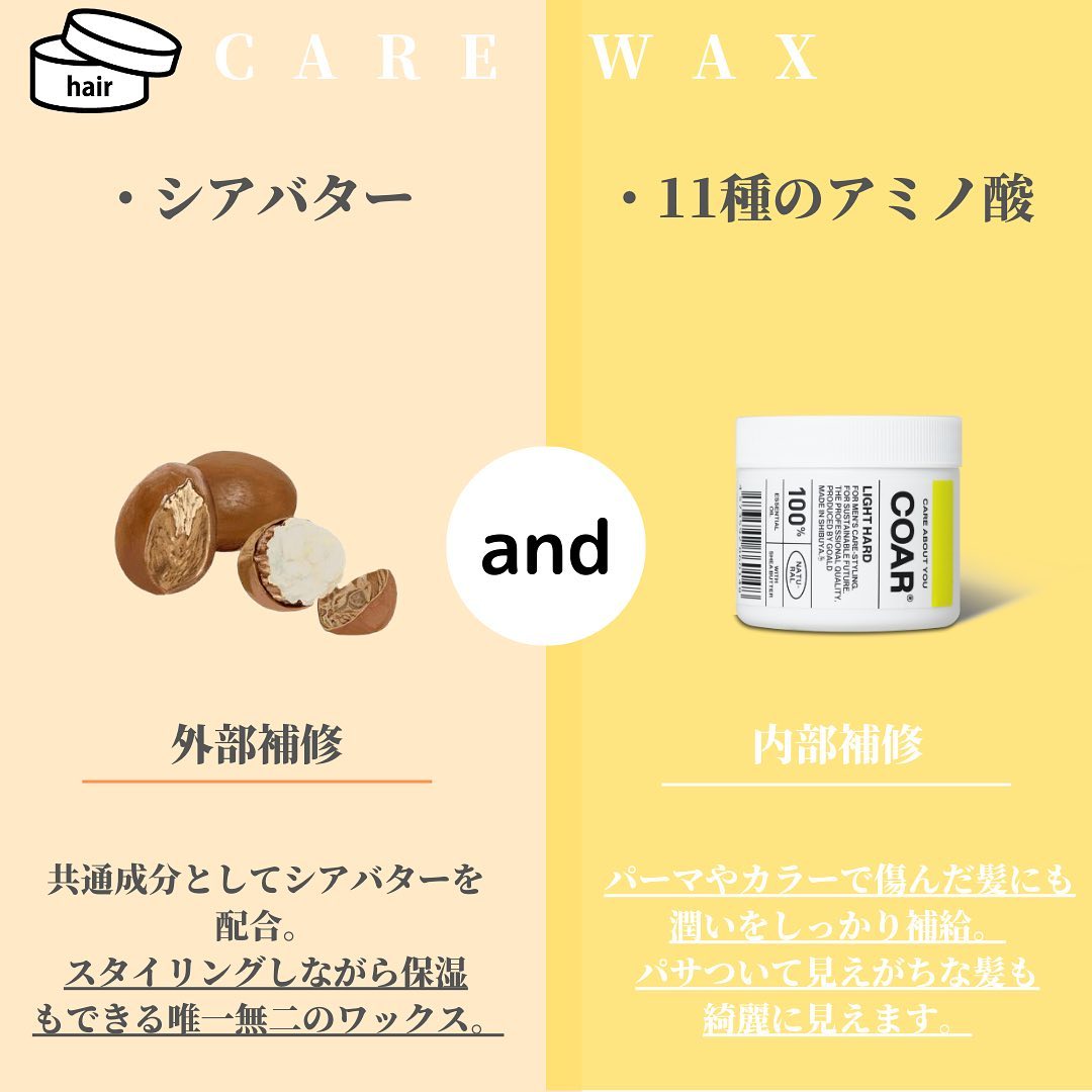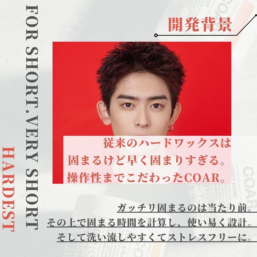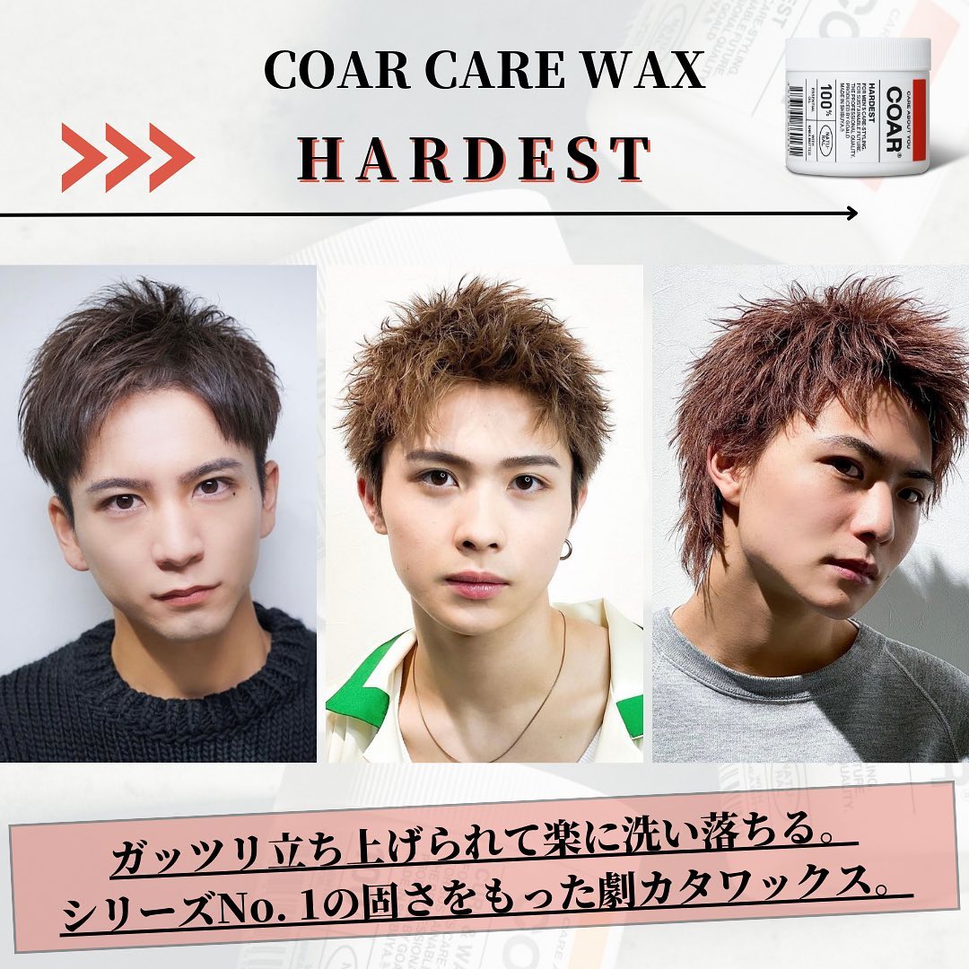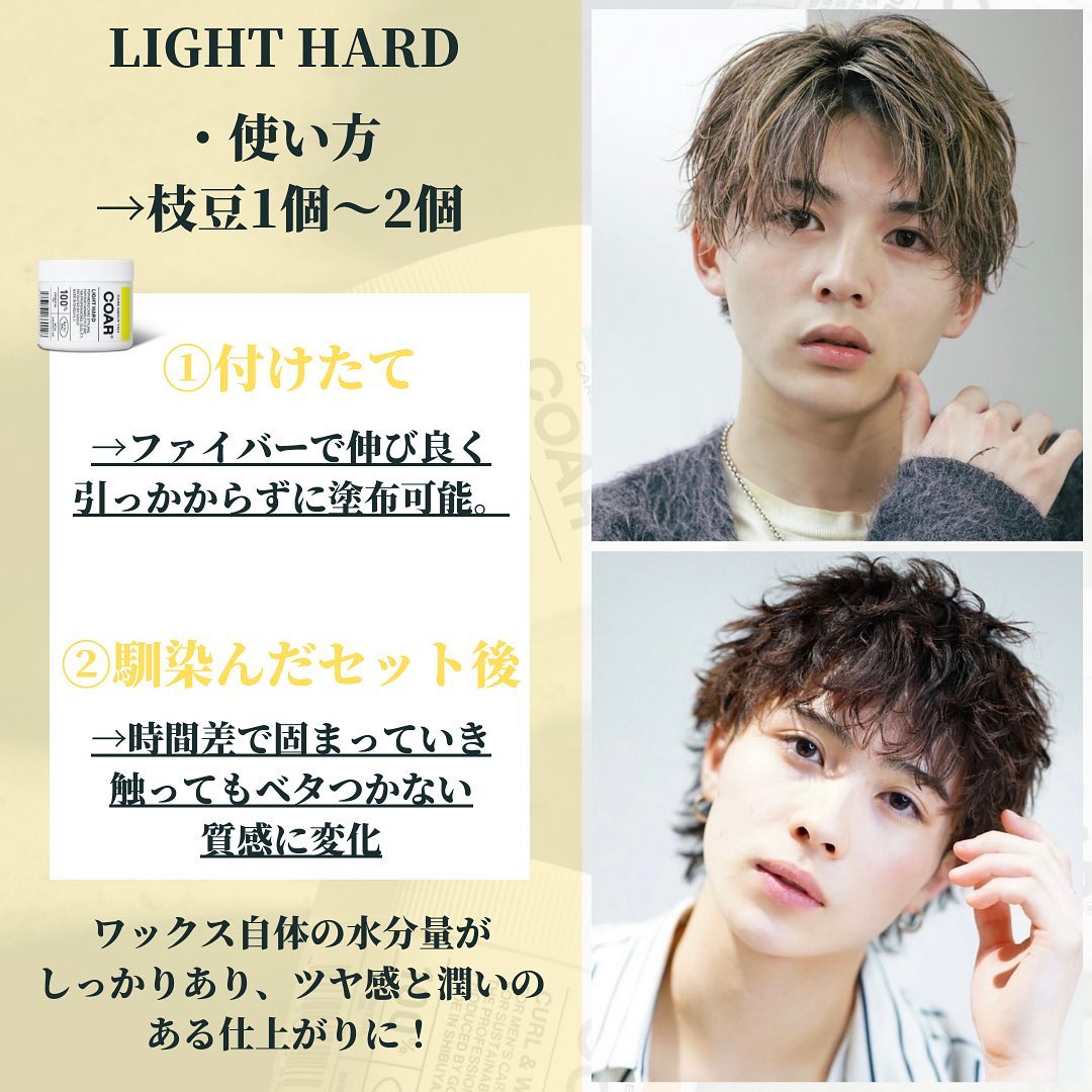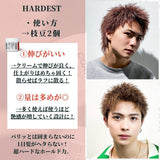 超ハード(硬いワックス)なのにジェル成分配合で固定するまでに時間があるため、髪を動かすことができます。